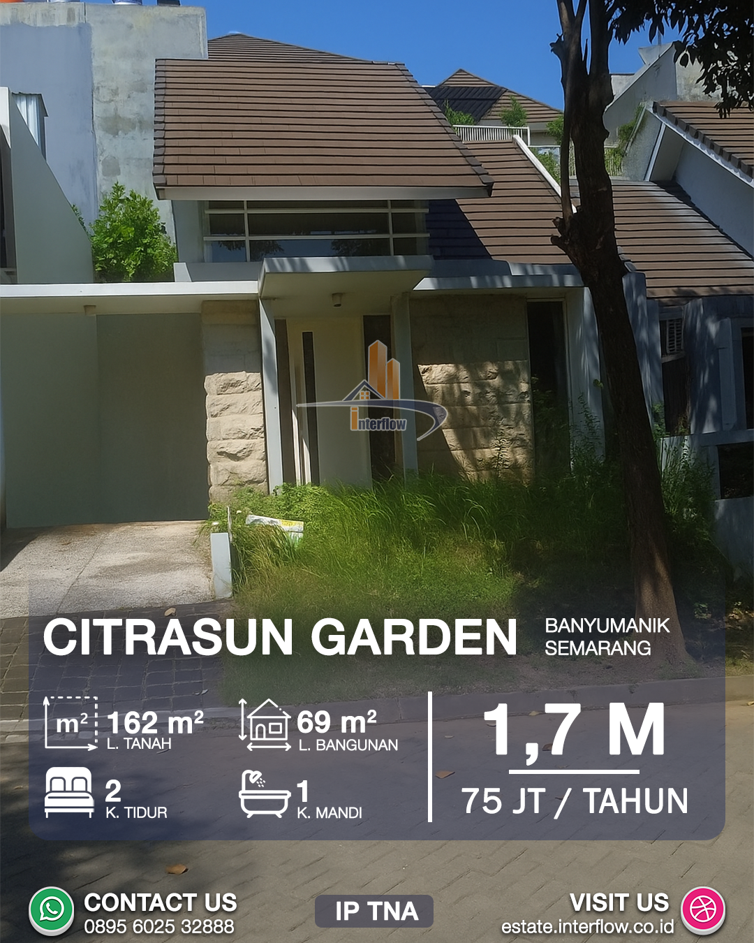Dijual atau disewakan rumah modern dengan desain elegan di Citrasun Garden, Banyumanik, Semarang. Berada di kawasan prestisius dengan lingkungan tenang, asri, dan aman. Hunian ini sangat cocok untuk keluarga yang mengutamakan kenyamanan maupun sebagai investasi properti bernilai tinggi.