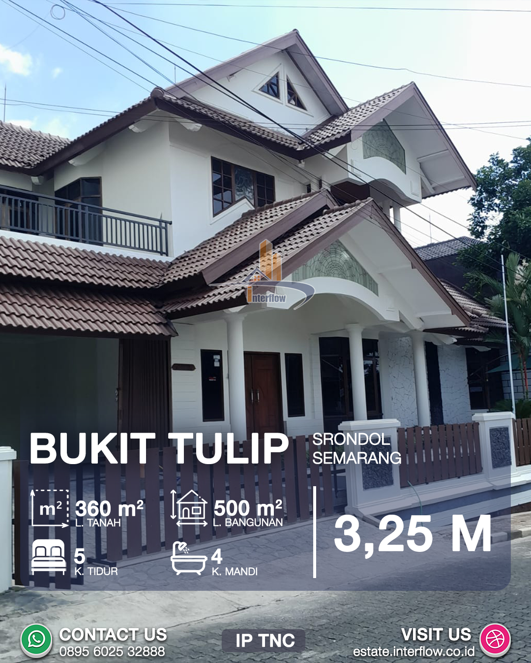 Dijual rumah mewah di Bukit Tulip, Srondol – Semarang, hunian megah dengan luas bangunan ±500 m² di atas tanah 360 m². Berada di lingkungan elit dengan sistem keamanan 24 jam dan one gate system, rumah ini sangat cocok untuk keluarga besar yang mengutamakan kenyamanan, keamanan, sekaligus akses strategis ke berbagai pusat aktivitas kota.