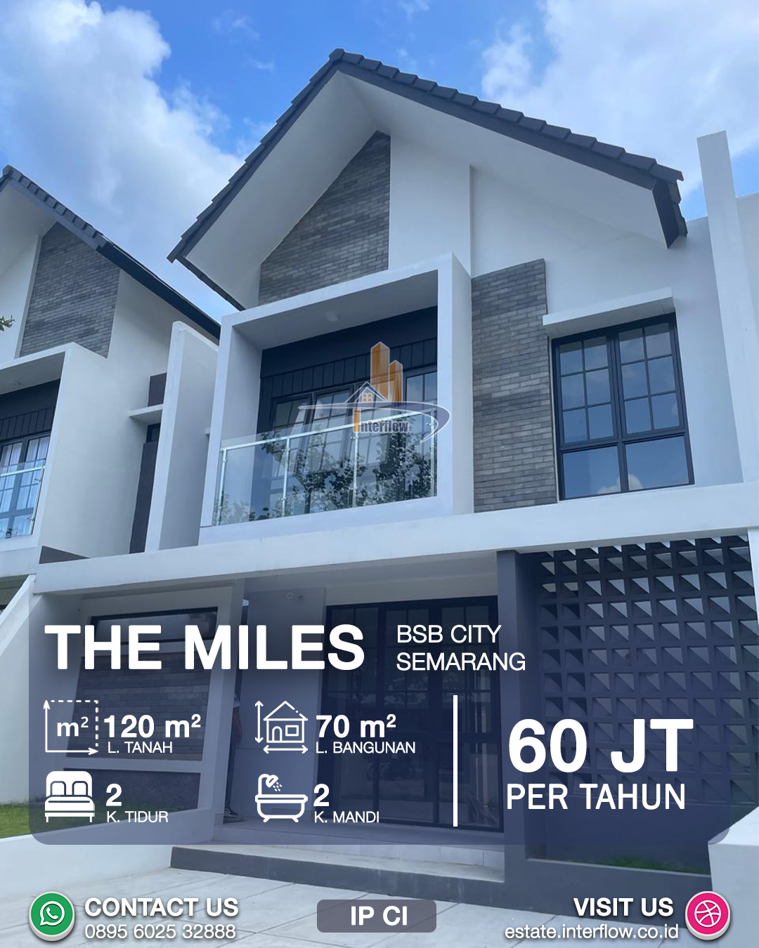 isewakan rumah modern minimalis di The Miles, BSB City Semarang. Hunian 2 lantai dengan desain elegan, semi furnish, dan berada di kawasan elit BSB City. Lingkungan aman, nyaman, serta asri, menjadikannya pilihan tepat untuk keluarga maupun eksekutif muda.