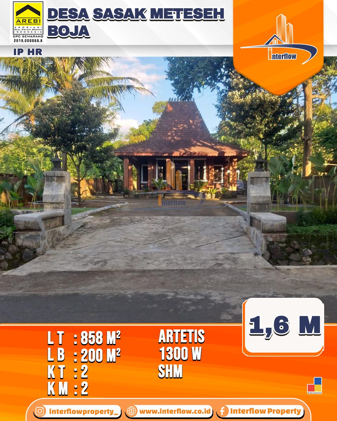 Dijual rumah luas di Desa Sasak Meteseh Boja. Tanah 850 m², bangunan 200 m², 2 kamar tidur, 2 kamar mandi, artetis, listrik 1300 Watt, SHM, lokasi strategis.