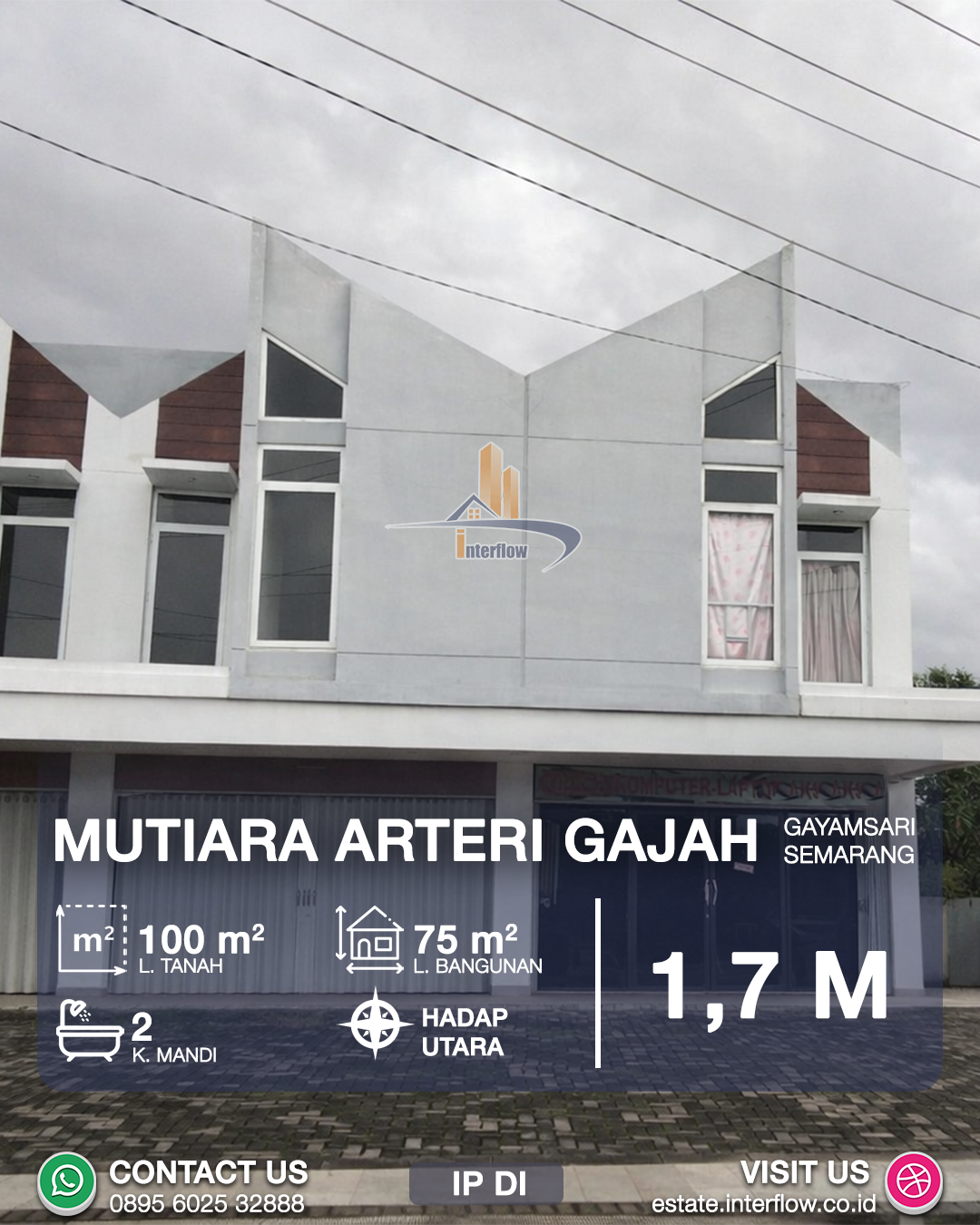 Dijual ruko 2 lantai di Mutiara Arteri Gajah Gayamsari Semarang. LT 100 m², HGB, lokasi jalur arteri utama, cocok untuk usaha. Harga 1,7 M.